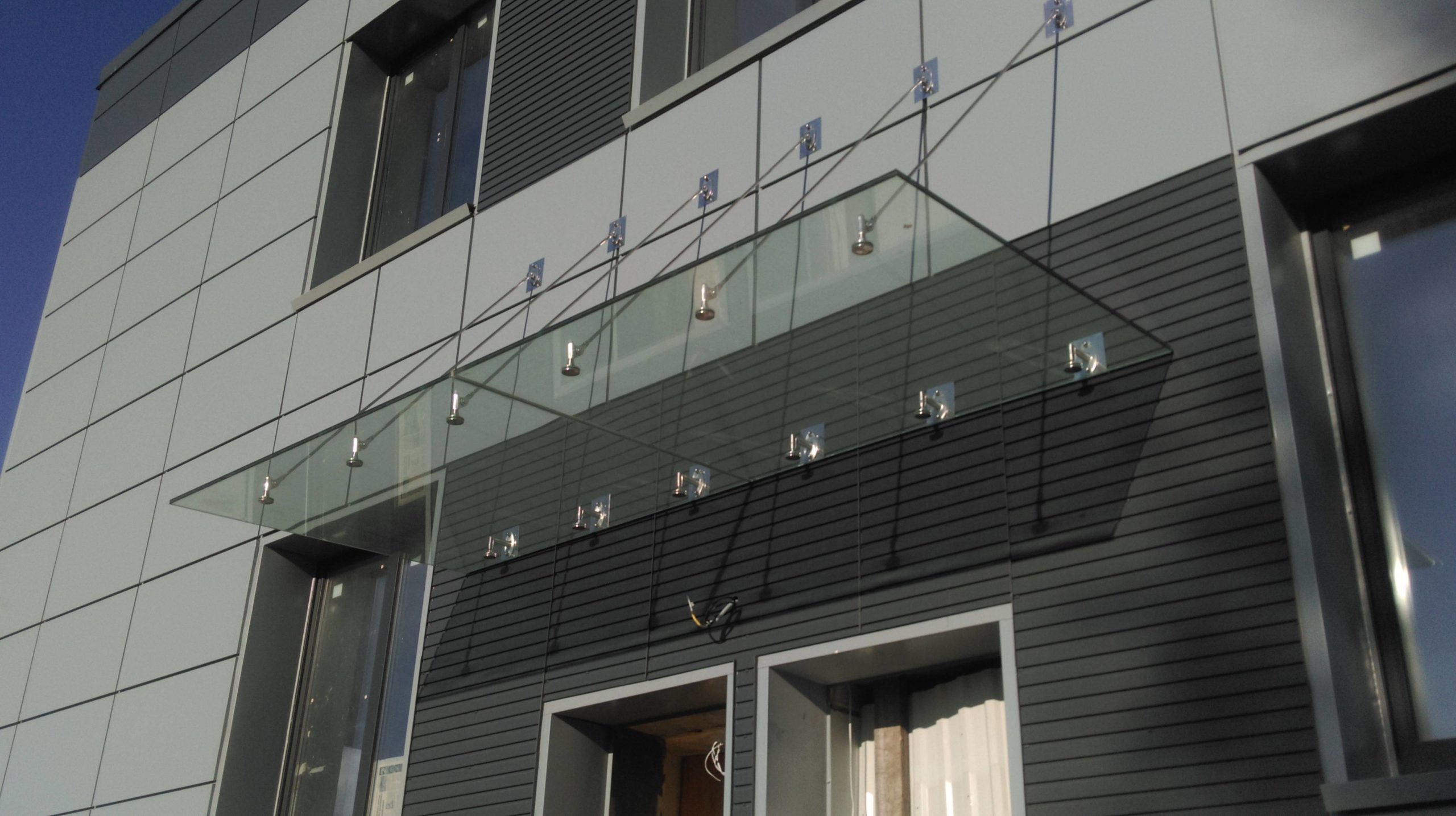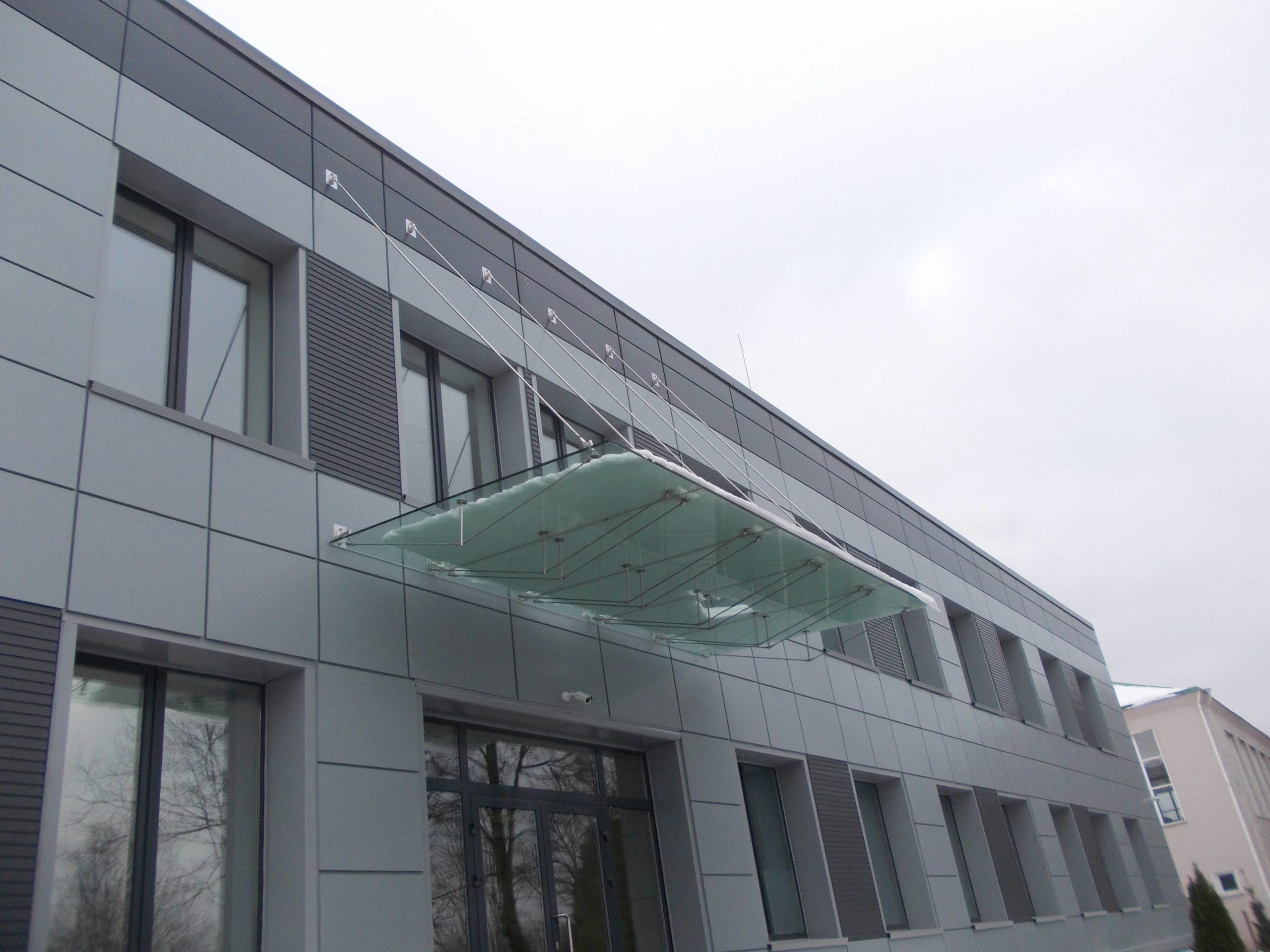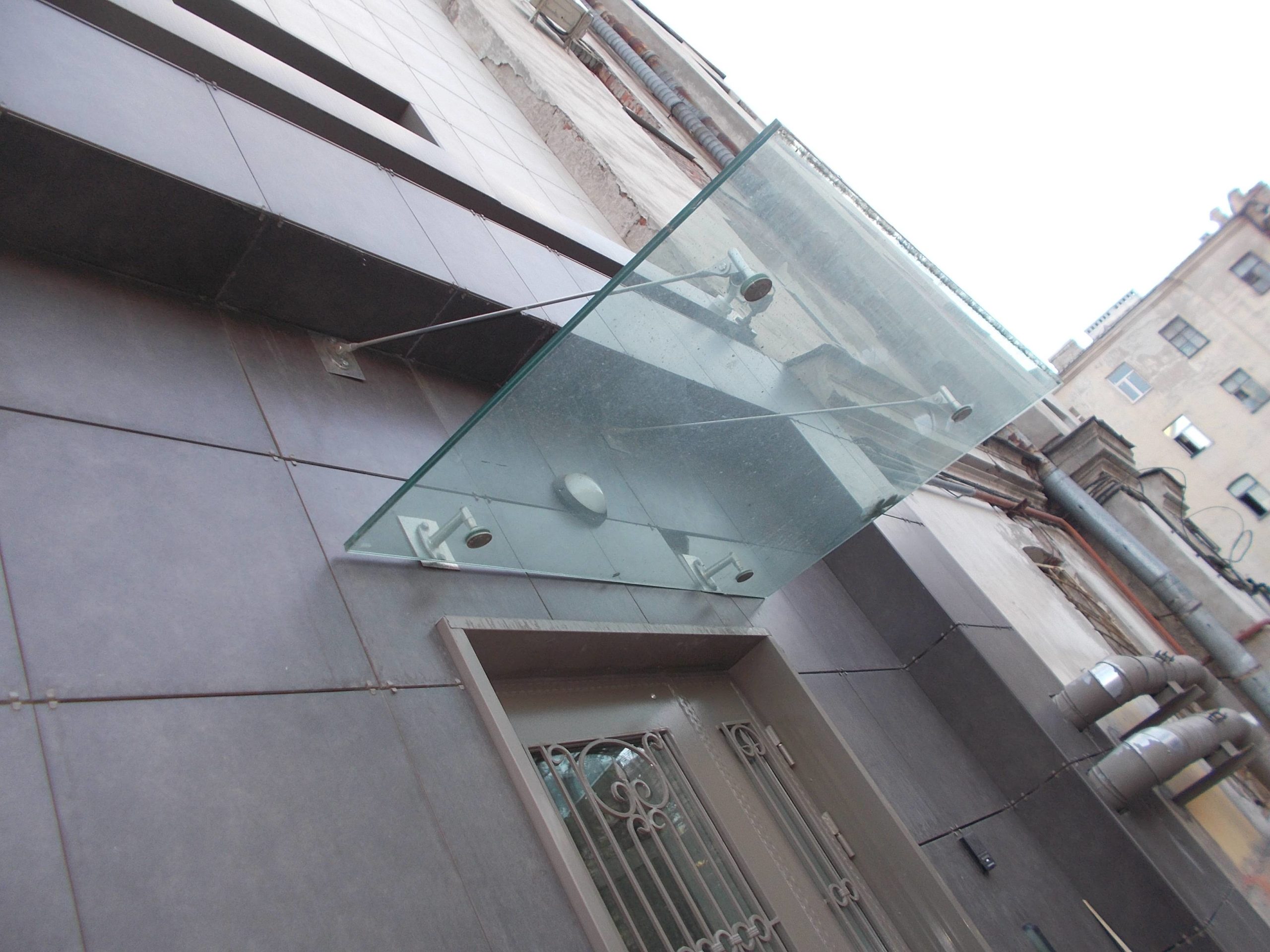 Компания «Охта Гласс» спроектирует, изготовит и смонтирует козырьки из стекла по Вашему проекту. Для изготовления стеклянных козырьков применяется триплекс из закаленного стекла, толщина которого рассчитывается в каждом конкретном случае, исходя из размера козырька и действующих на него нагрузок.