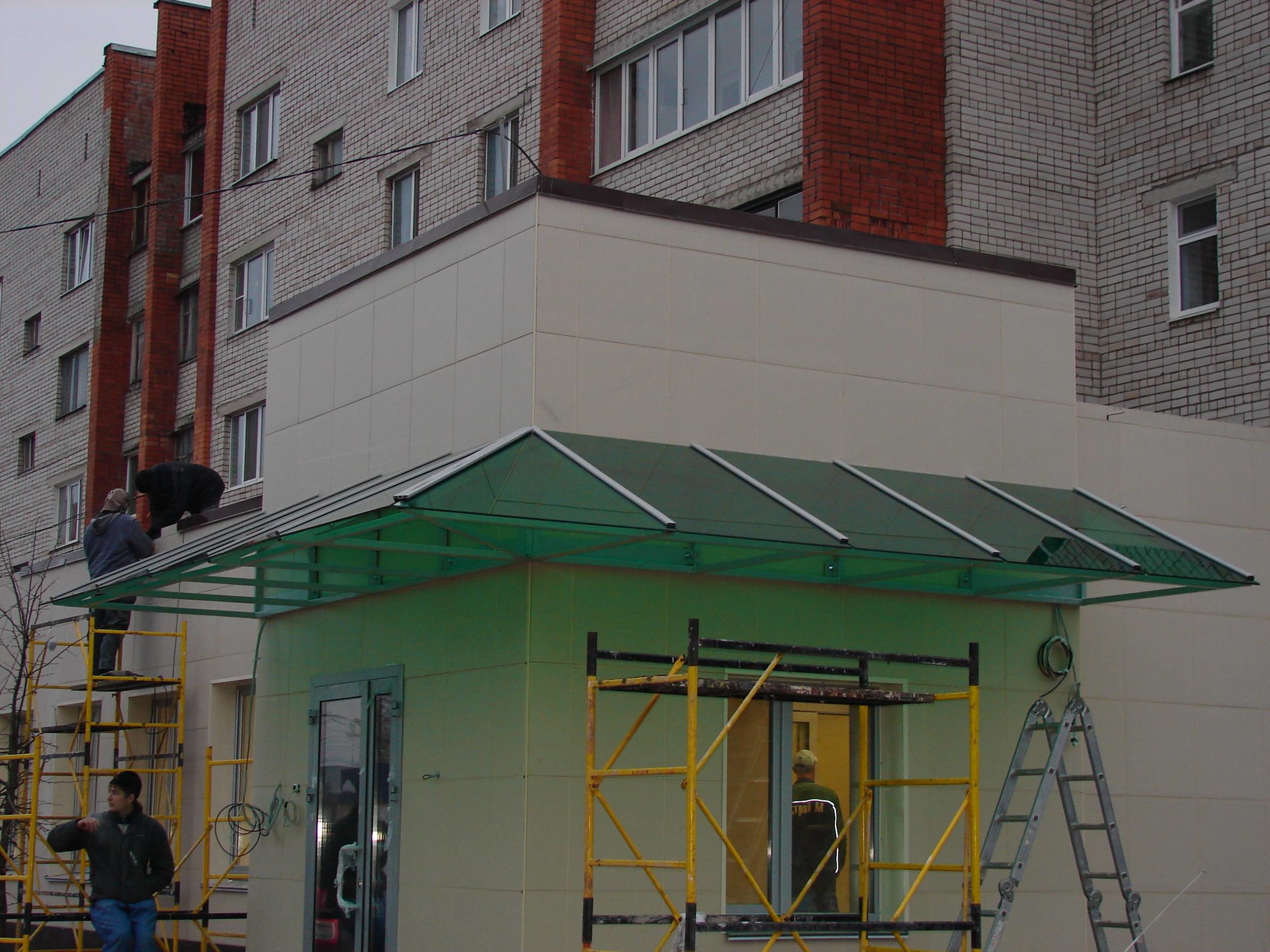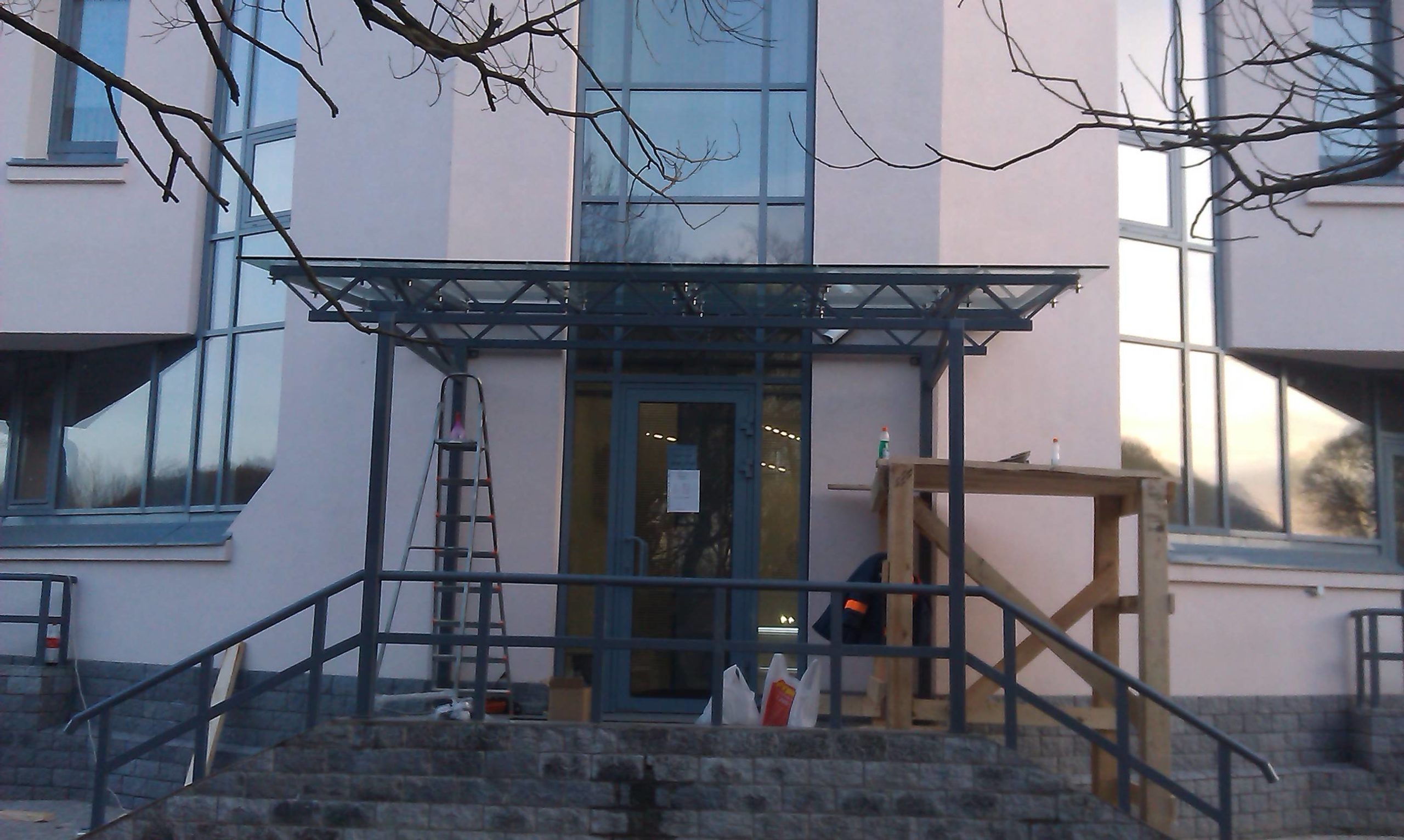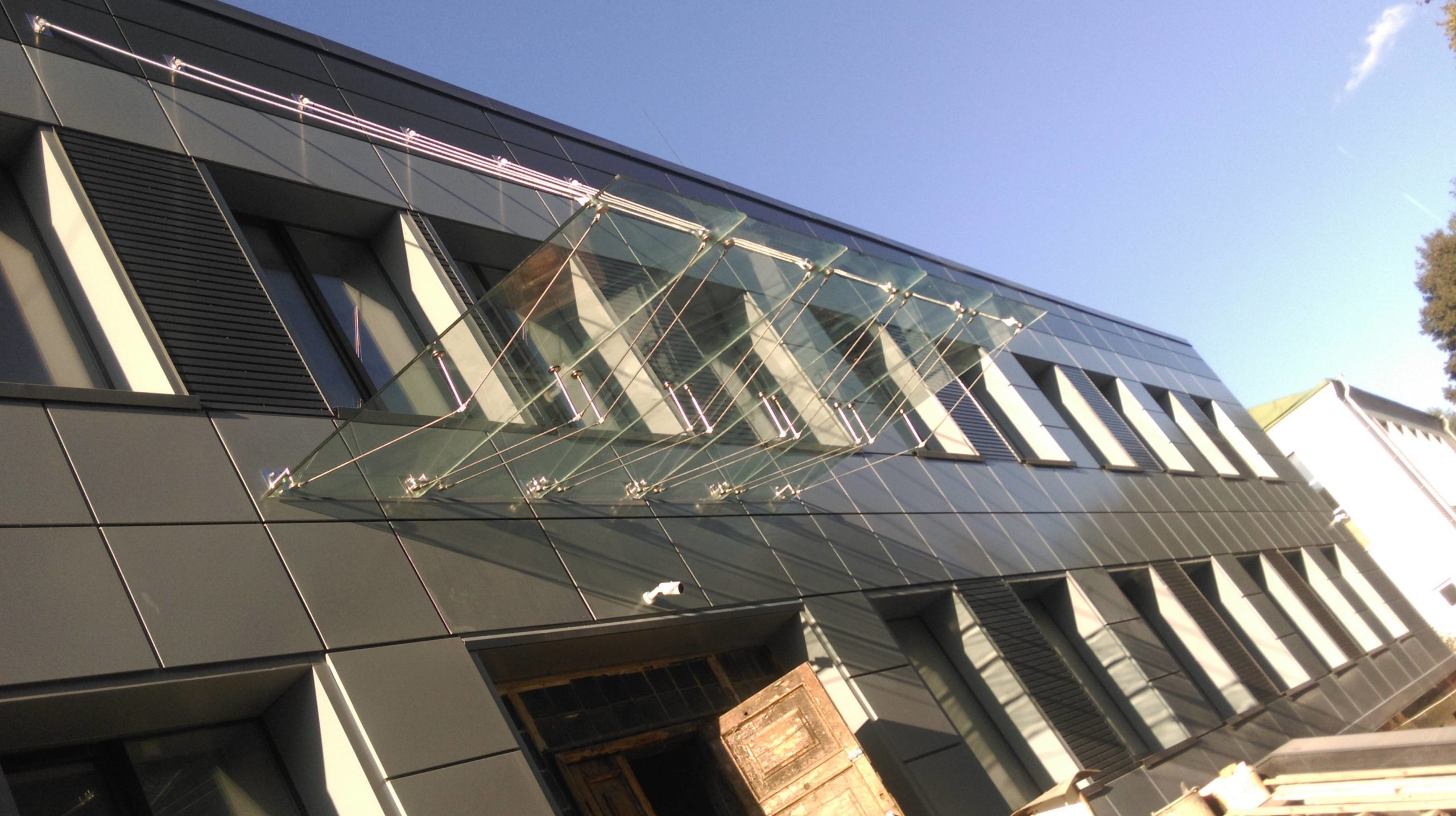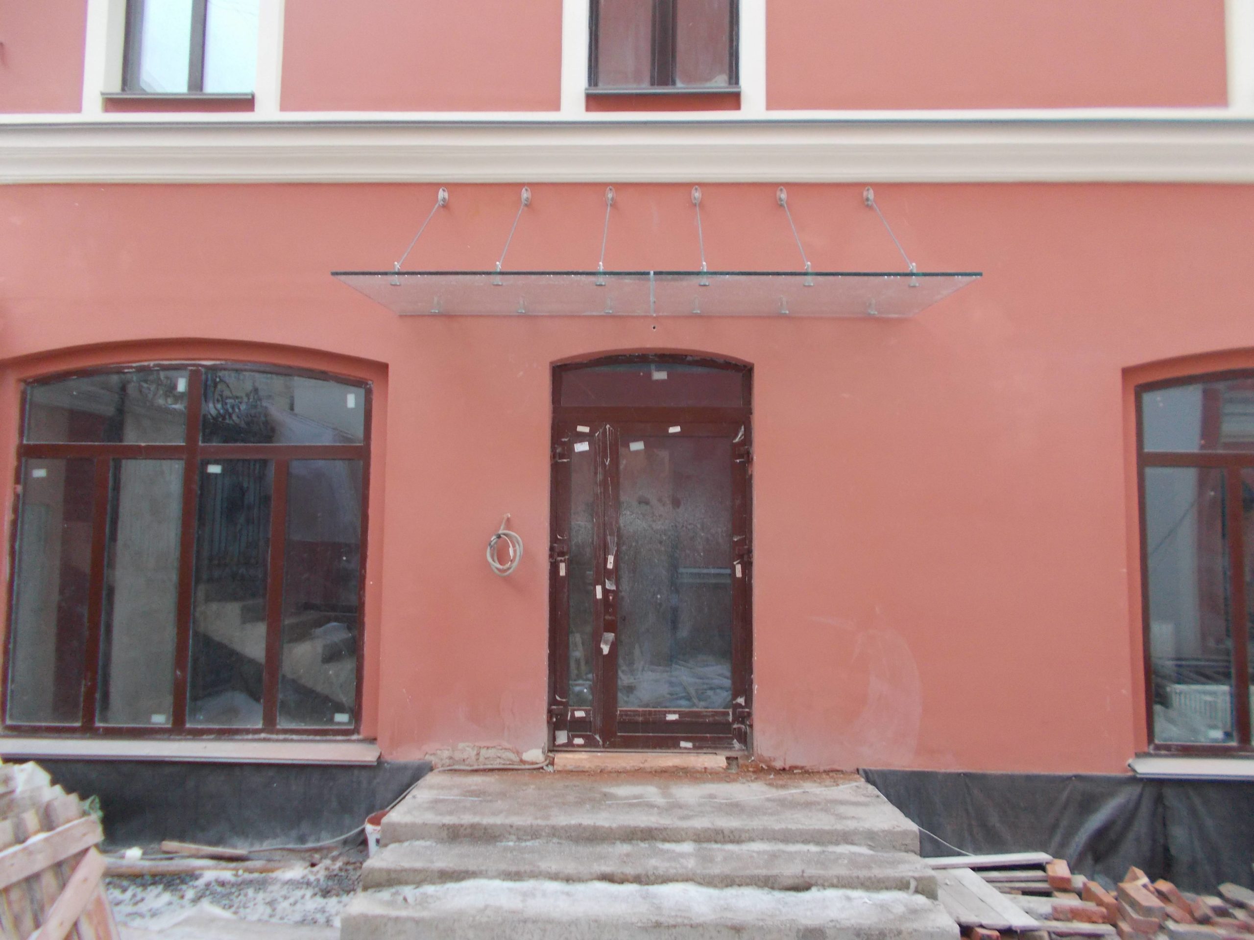 Компания «Охта Гласс» спроектирует, изготовит и смонтирует козырьки из стекла по Вашему проекту. Для изготовления стеклянных козырьков применяется триплекс из закаленного стекла, толщина которого рассчитывается в каждом конкретном случае, исходя из размера козырька и действующих на него нагрузок.