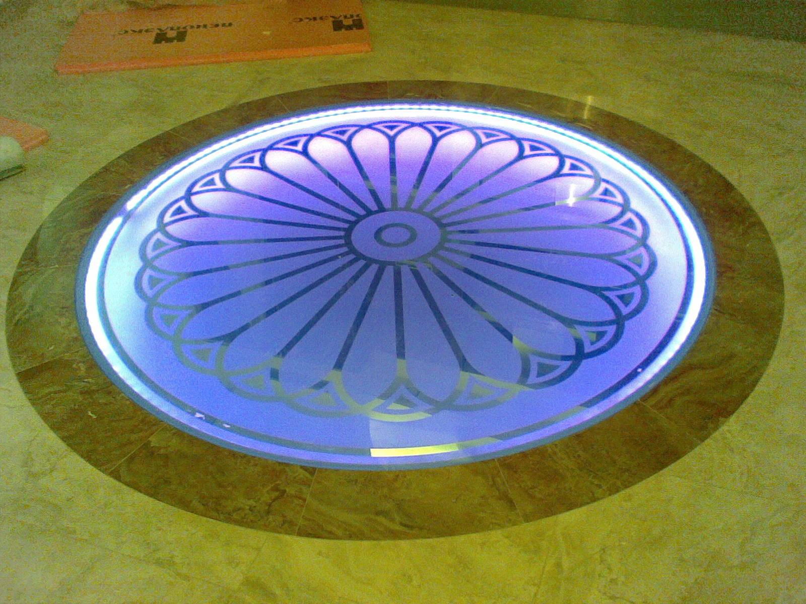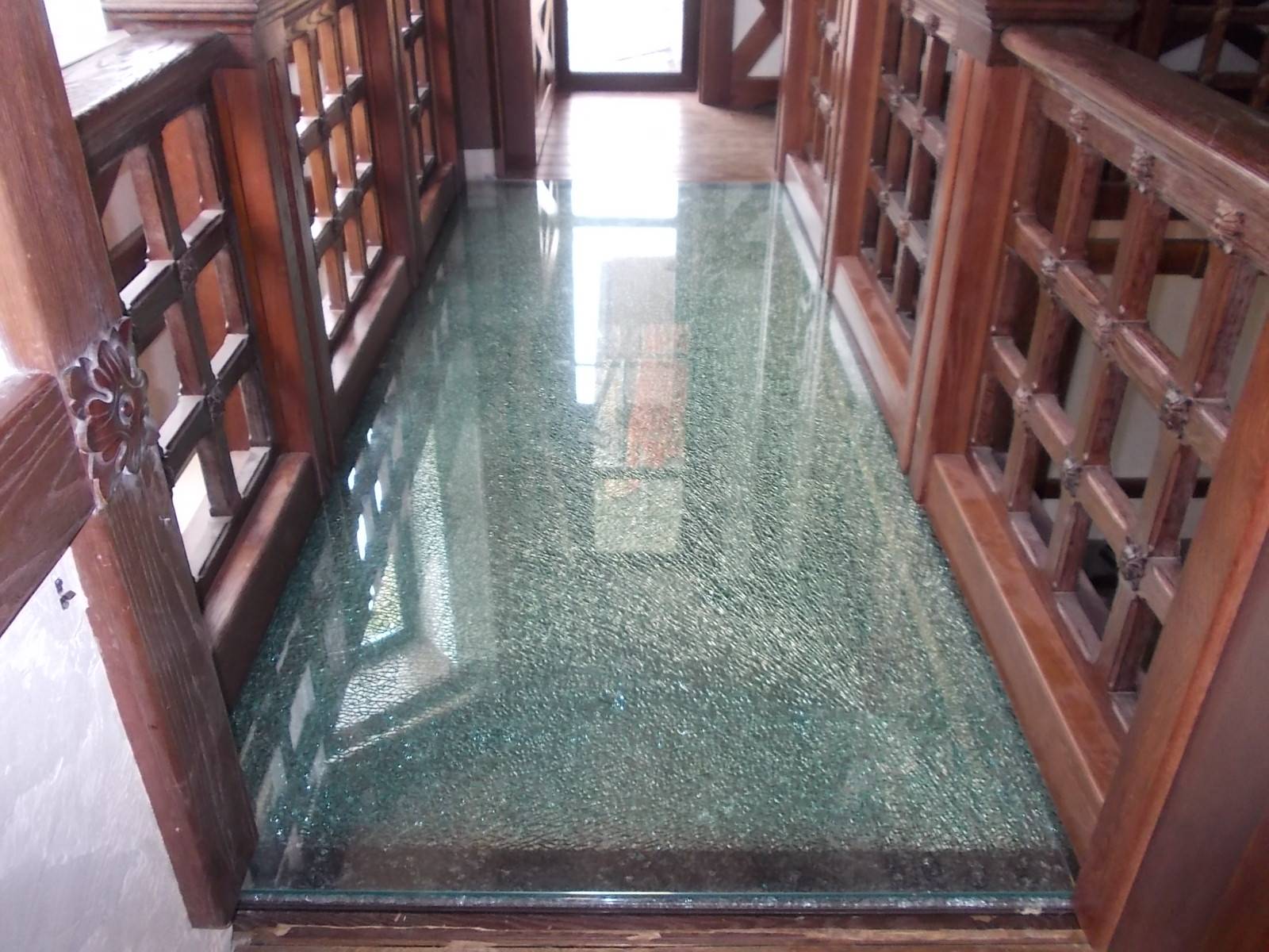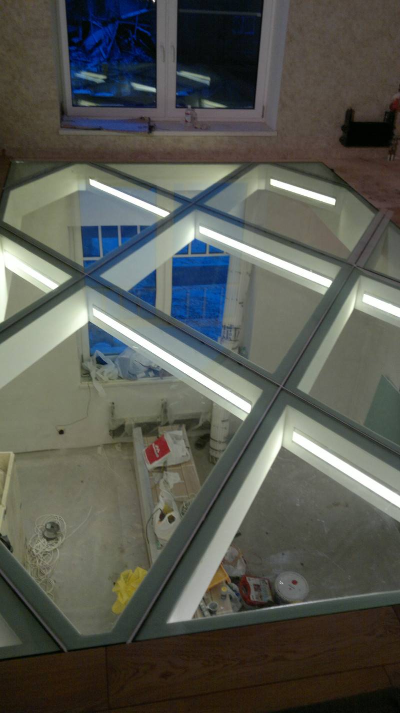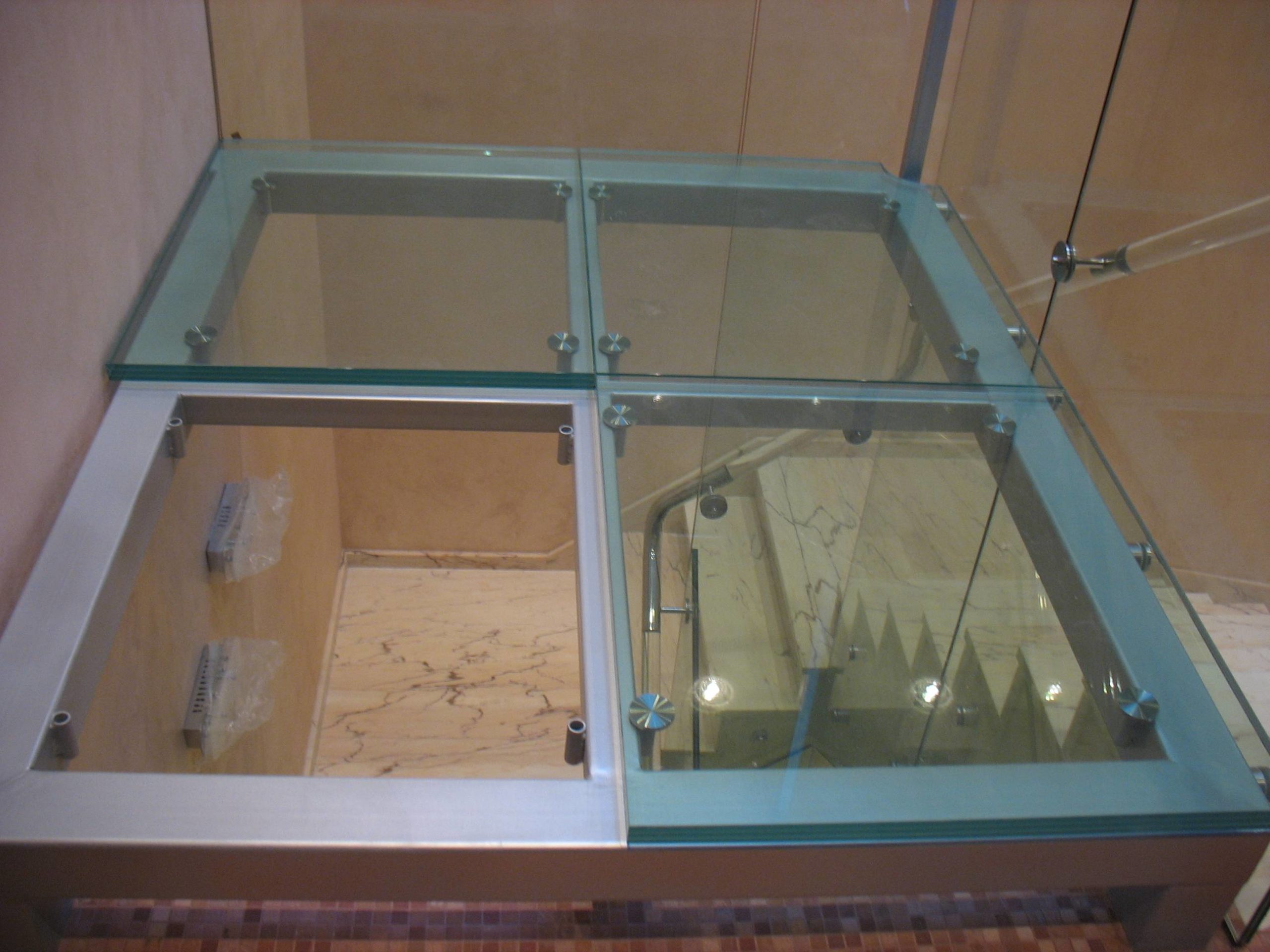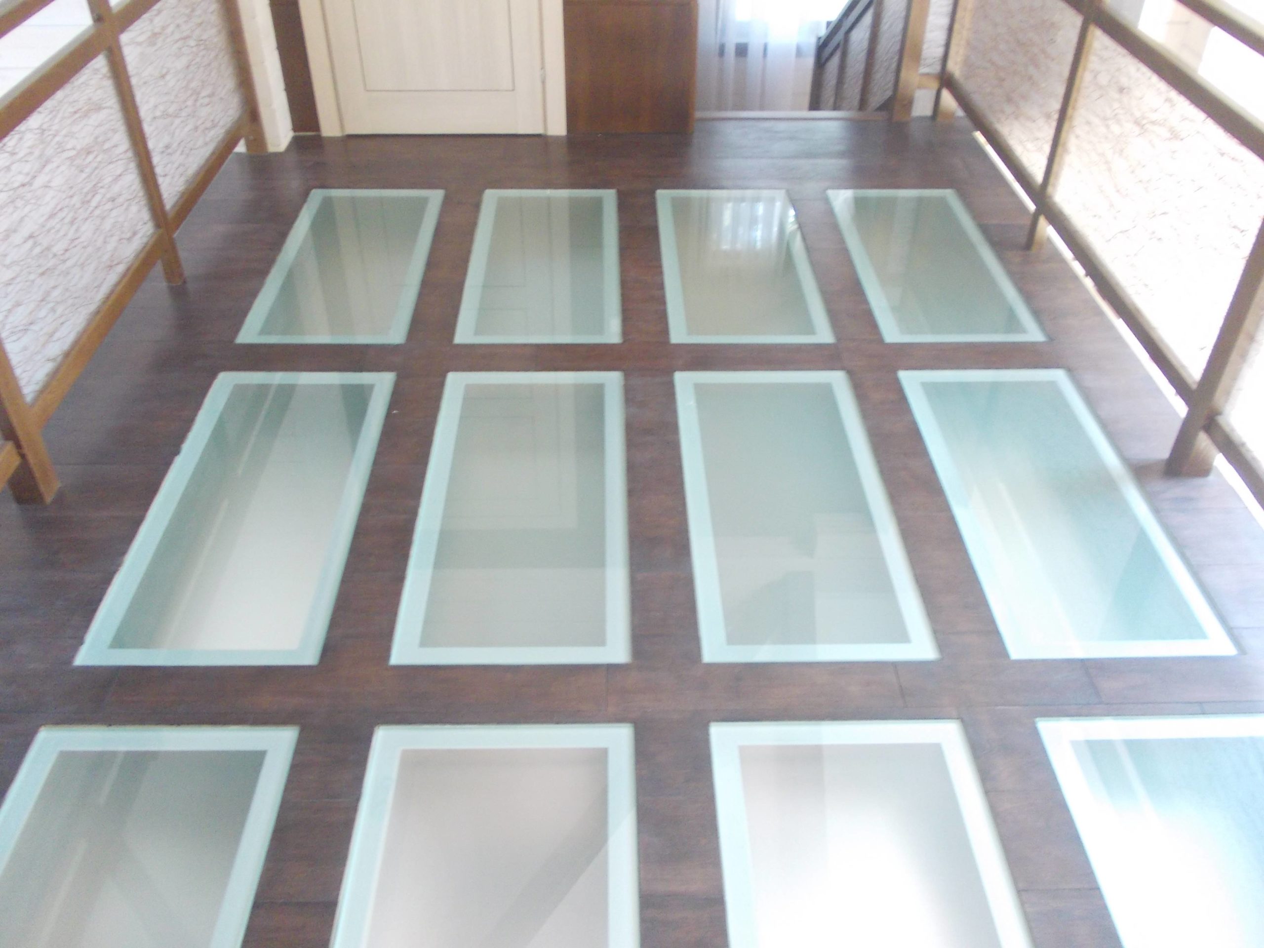 Стеклянные полы делятся на 2 типа: пол-пол и пол-потолок. В первом случае на силовую металлическую подоснову выкладываются элементы стеклянного пола через специальные прокладки, и заполняется зазор между плитами. Во втором случае изготавливается силовая подоснова пола, которая должна быть строго выставлена по расстоянию до пола, плоскостными и геометрическими характеристиками.