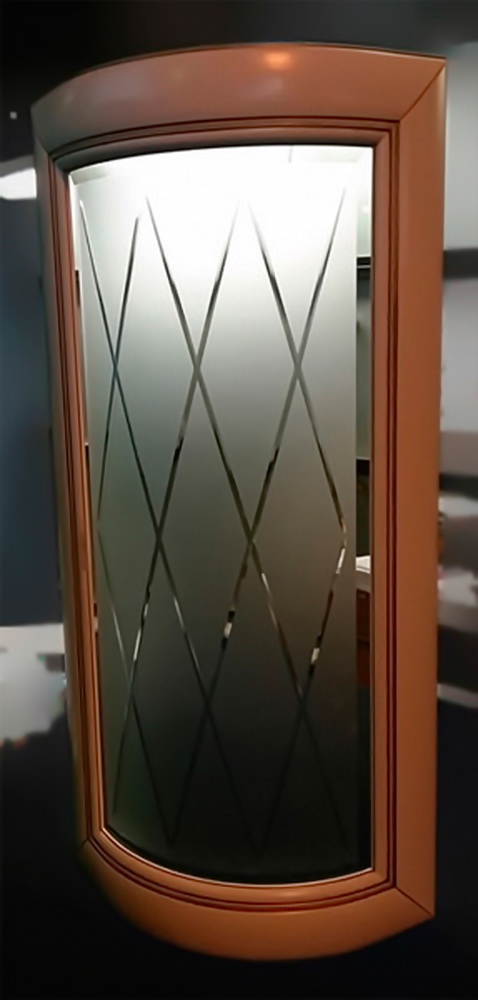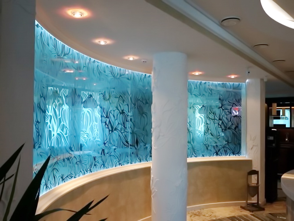 - Так же гнутое стекло может изготавливаться с нанесением пескоструйных рисунков.
