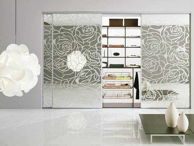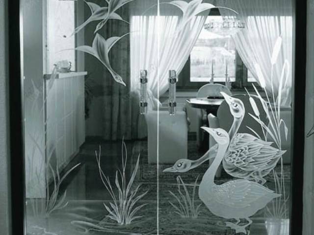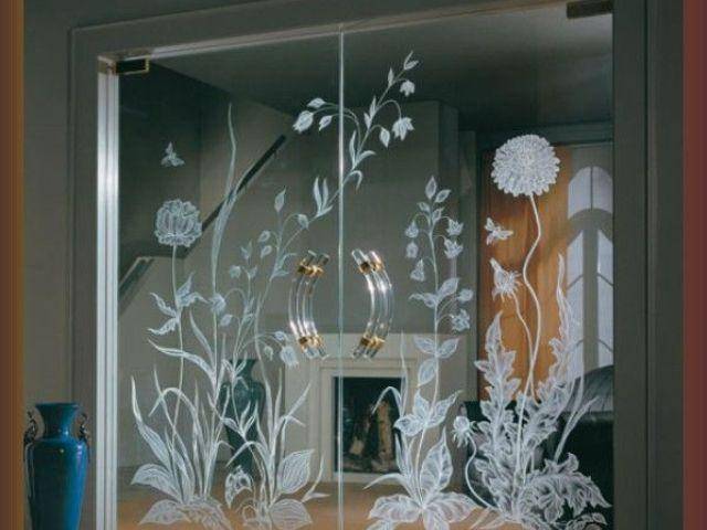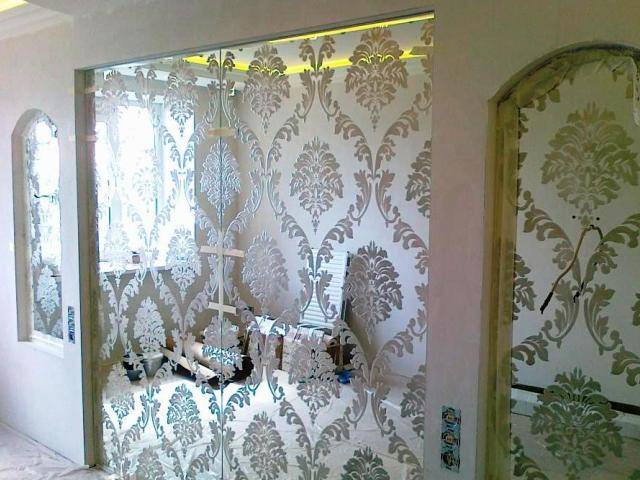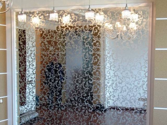 Спектр применения пескоструйной обработки на стекломатериалах очень широк. Самое распространенное — это стекла в межкомнатные двери, зеркала в шкафы купе, а также мебель, столешницы, цельностеклянные двери, витражи, перегородки и т.п.
