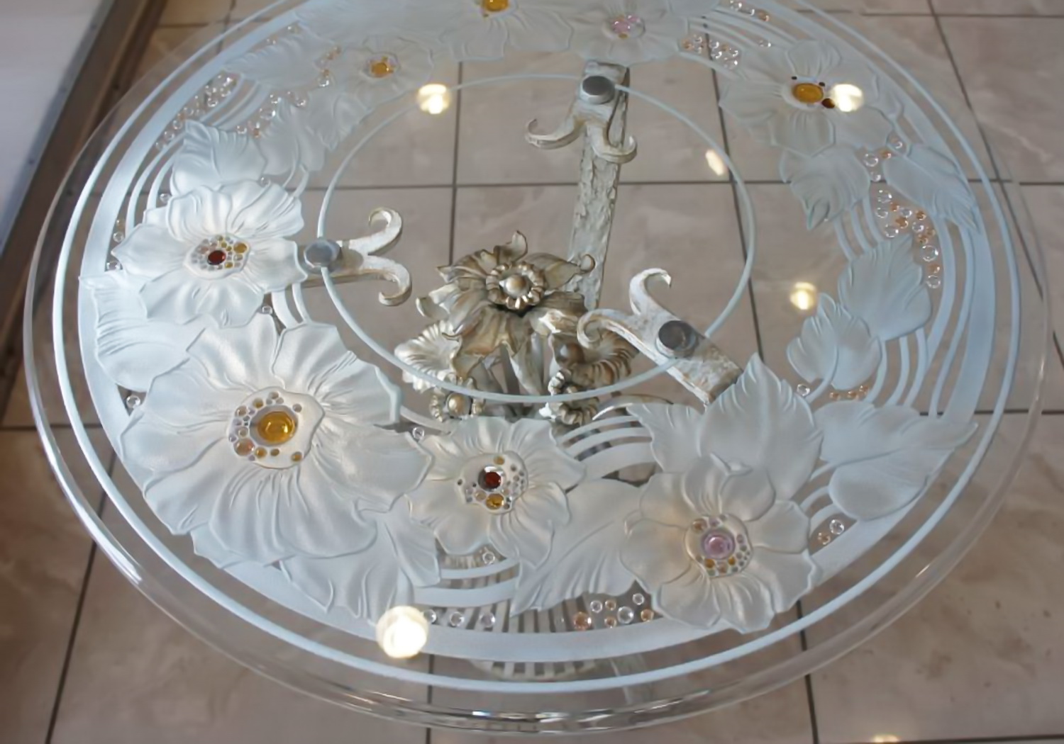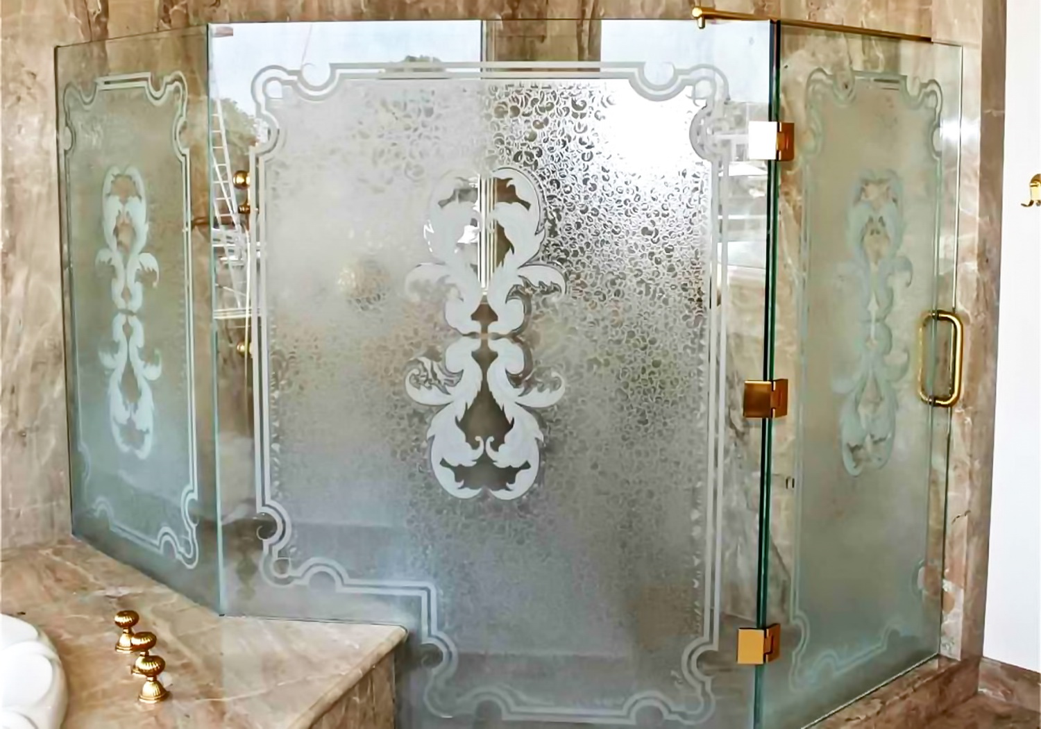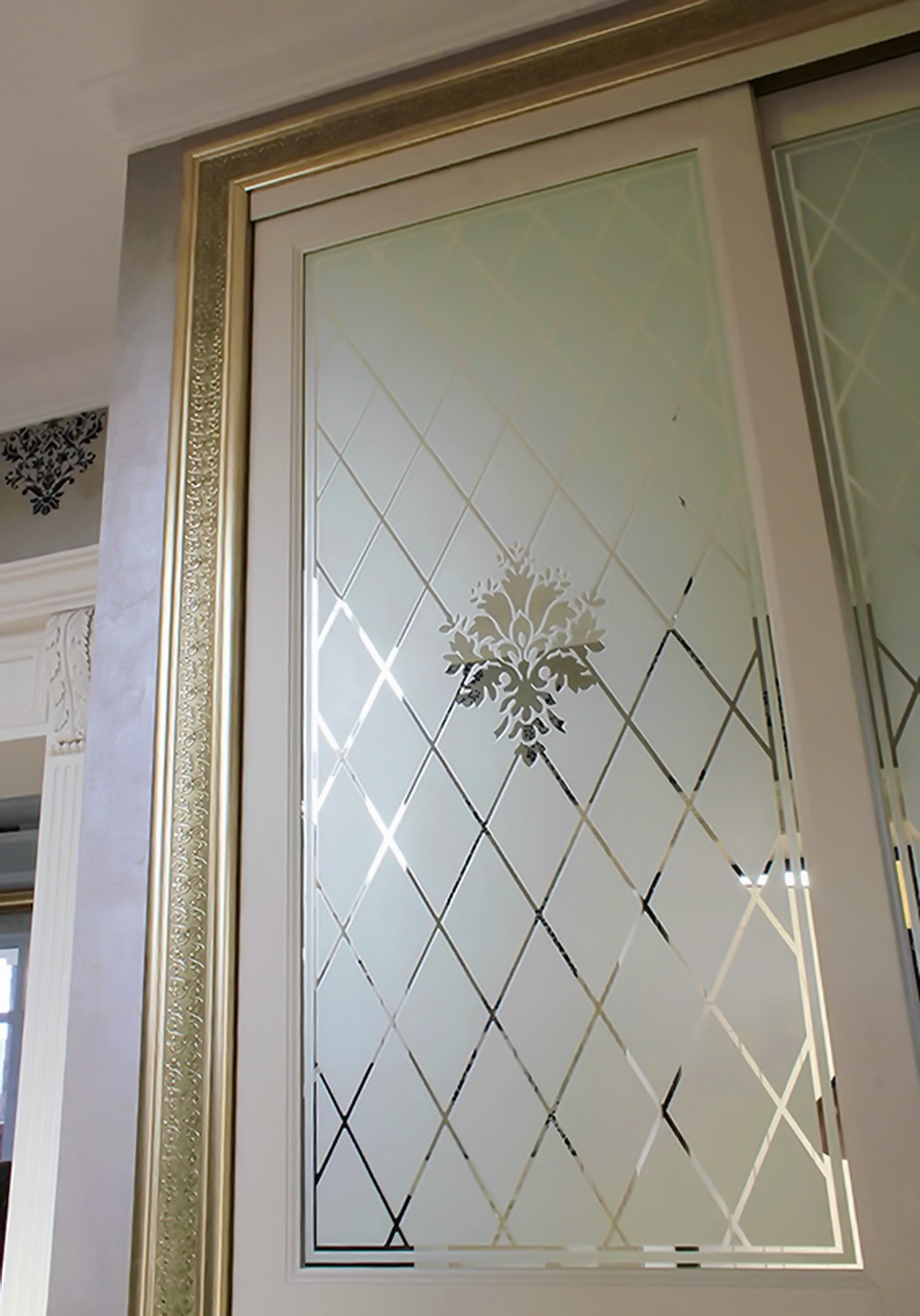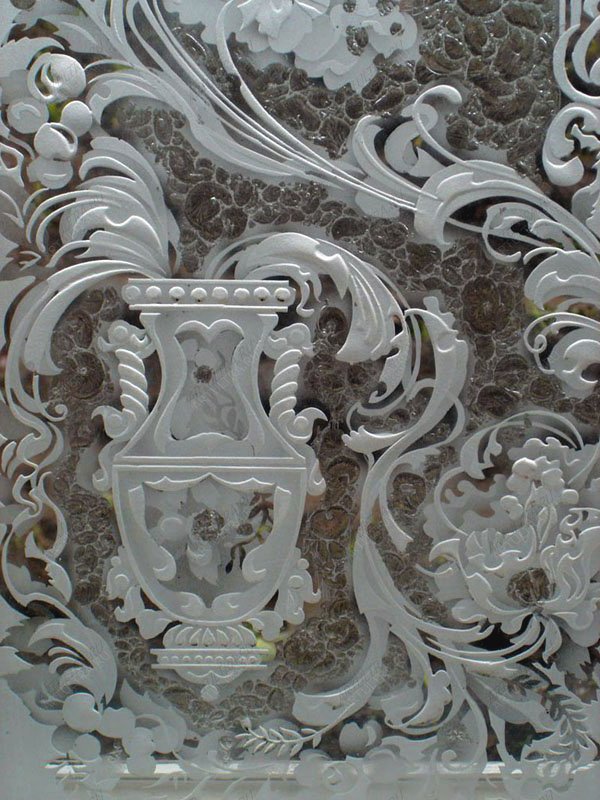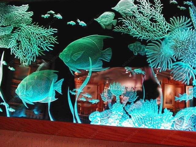 Этот способ декоративной обработки стекла придает неповторимый и изящный вид изделиям из стекла и зеркала. Изображения получаются трафаретного типа, с хорошей степенью детализации, в следствии чего выглядят достаточно реалистично. Неповторимость пескоструйных рисунков и орнаментов достигается чередованием матовой и глянцевой поверхностей, а также различной глубиной и шероховатостью пескоструйной обработки.