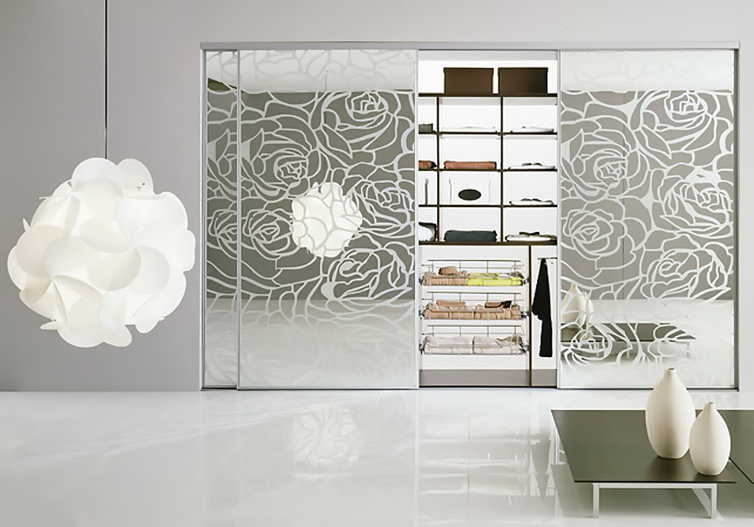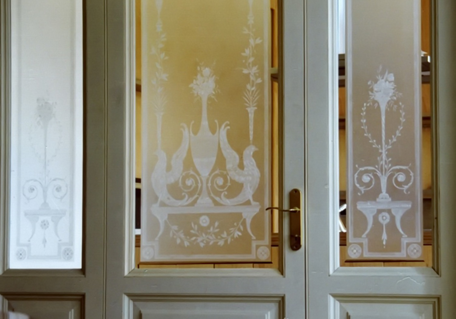 Спектр применения пескоструйной обработки на стекломатериалах очень широк. Самое распространенное — это стекла в межкомнатные двери, зеркала в шкафы купе, а также мебель, столешницы, цельностеклянные двери, витражи, перегородки, зеркальные панно, стеклянная посуда, люстры, светильники и другие предметы интерьера.