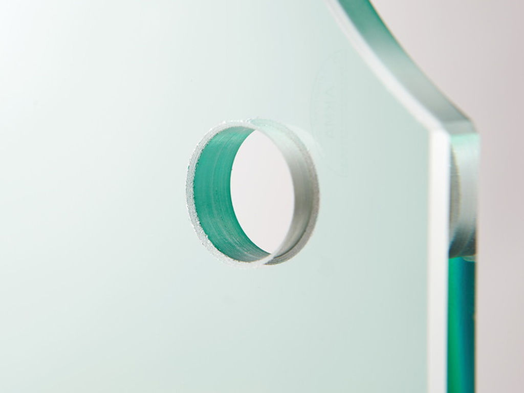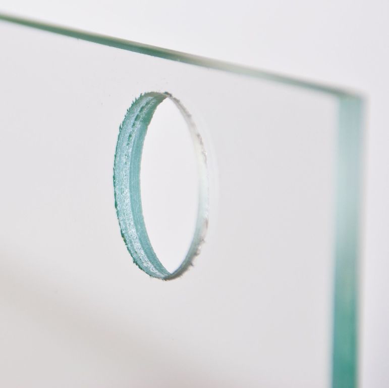 Отверстия в стекле обычно предназначены для использования различной фурнитуры при изготовлении стеклянных дверей, деталей стеклянной мебели, витрин, торгового оборудования. Для притупления острых кромок отверстия, выполняется зенкование.